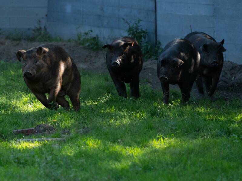 Unsere Schweine der Rasse Duroc leben das ganze Jahr über in einem festen Offenstall. Dort entscheiden sie selbst, ob sie die Sonne auf ihrer Weide genießen, ein Schlammbad nehmen oder sich im Schatten des Stalls etwas abkühlen.